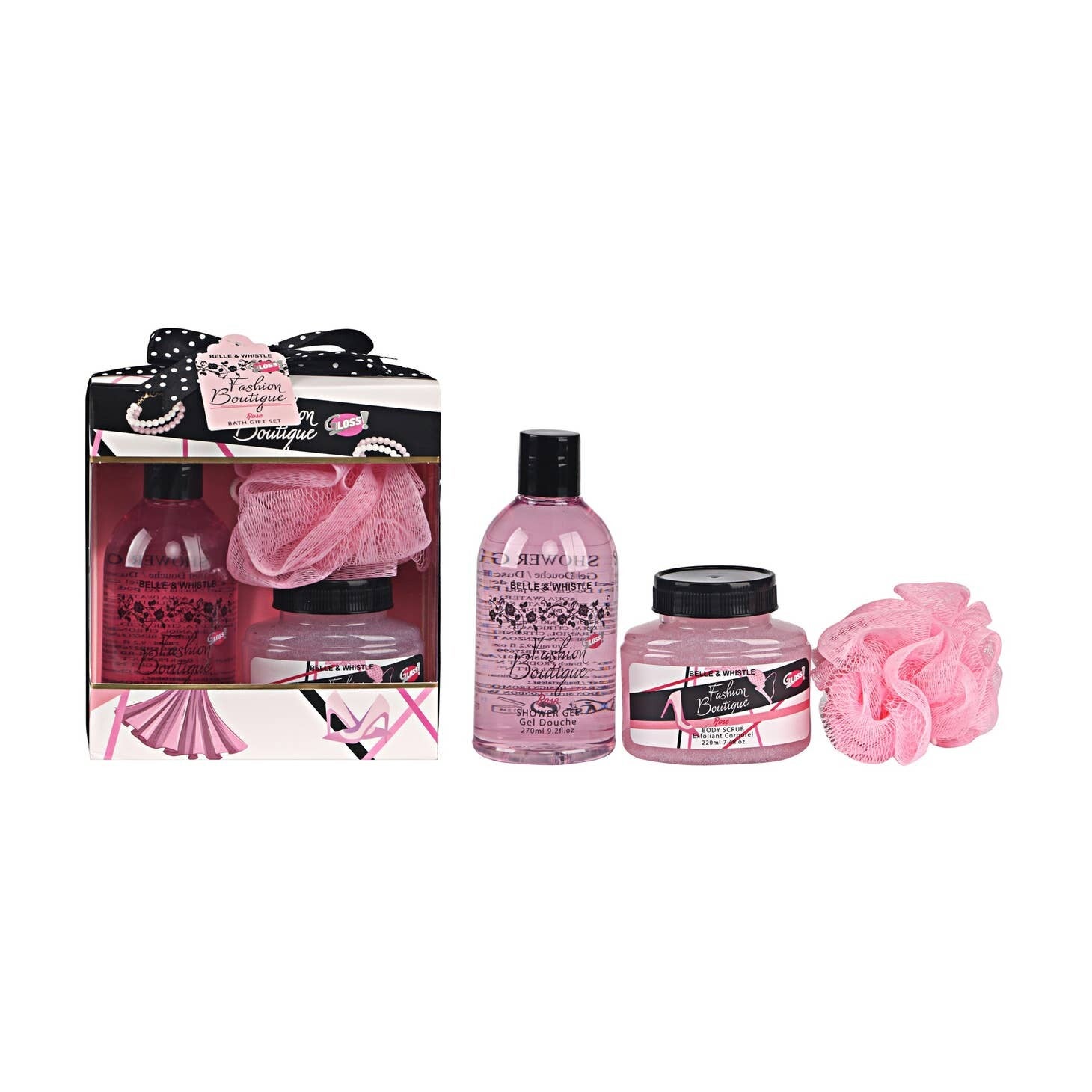 Deze set bevat een douchegel, body scrub en badspons.