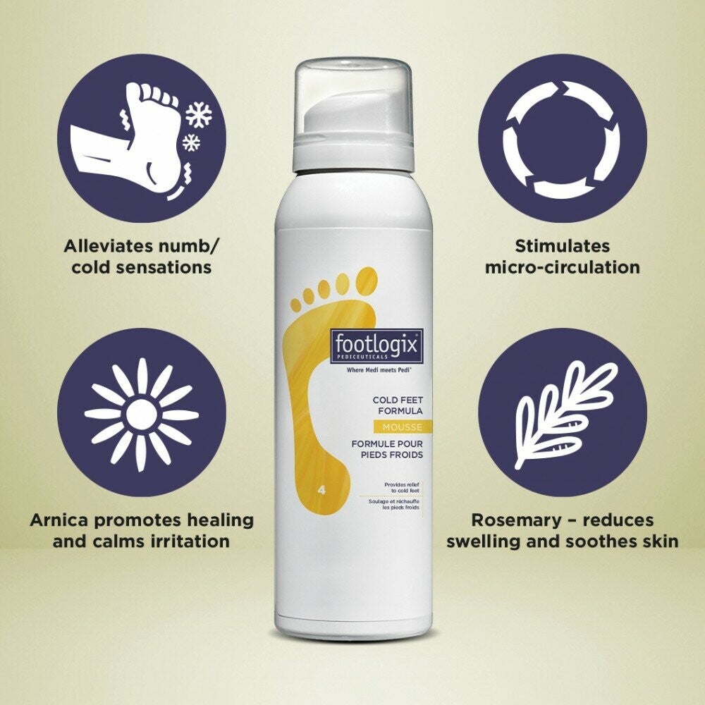 Footlogix® Cold Feet Formula met Dermal Infusion Technology® stimuleert de microcirculatie en biedt een bewezen verlichting bij chronisch koude voeten. Bevat arnica en rozemarijn om de bloedsomloop te stimuleren en ureum om vocht vast te houden. Stimuleert de huid en verlicht gevoelloze of koude gevoelens.